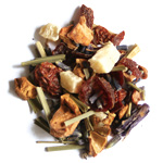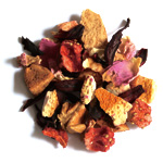 リンゴの果肉にハイビスカス、いちご片、オレンジ、かわいらしいピンクの野バラがたくさん散りばめられた、一番人気のフルーツティです。赤い果実とバラの花びらの甘く美しい香りが楽しめます。